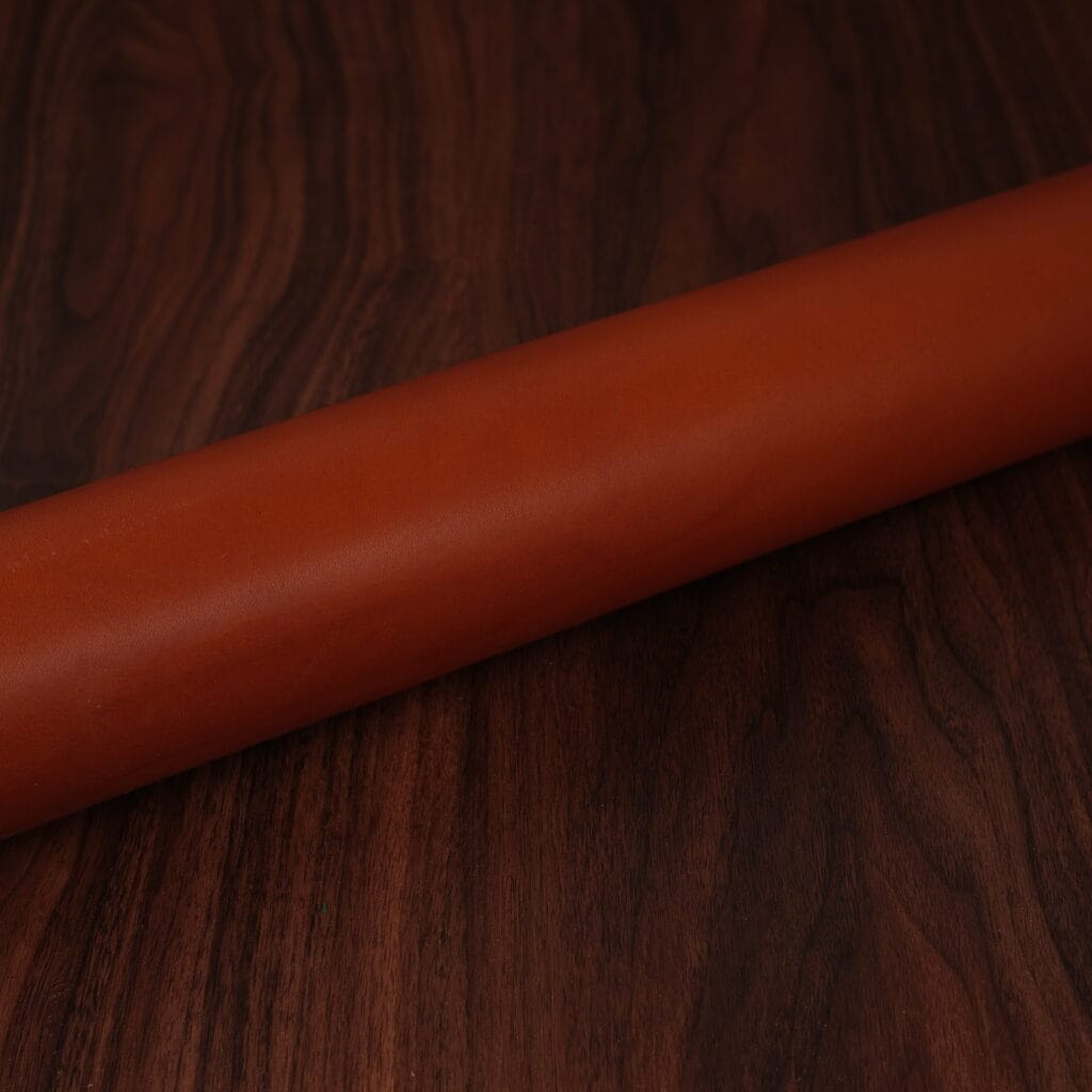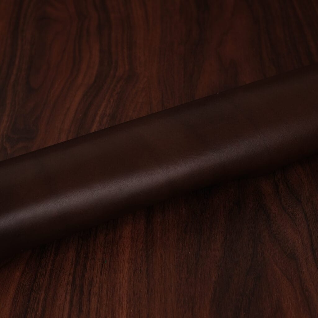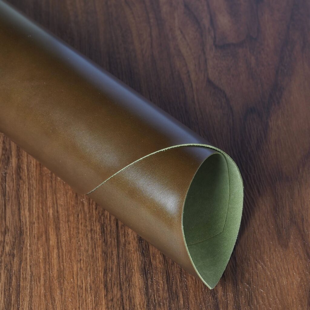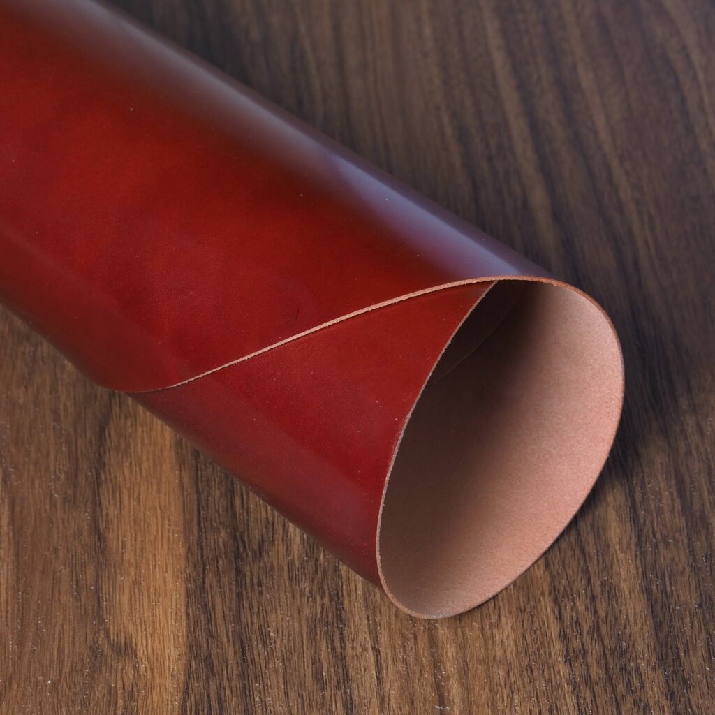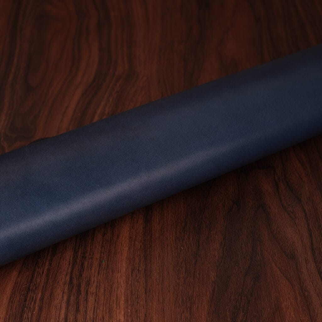 This is one of the world’s best known leathers, thanks to its extensive use in fine footwear. Museum calf is slightly glossy with a lovely marbling dye effect. The colors come off fairly dark and understated. It has a pleasant soft hand, yet firm temper. Softens with age and brushes up beautifully. Excellent choice for the exterior of items.
