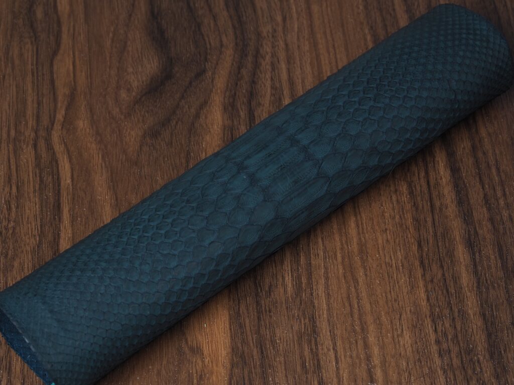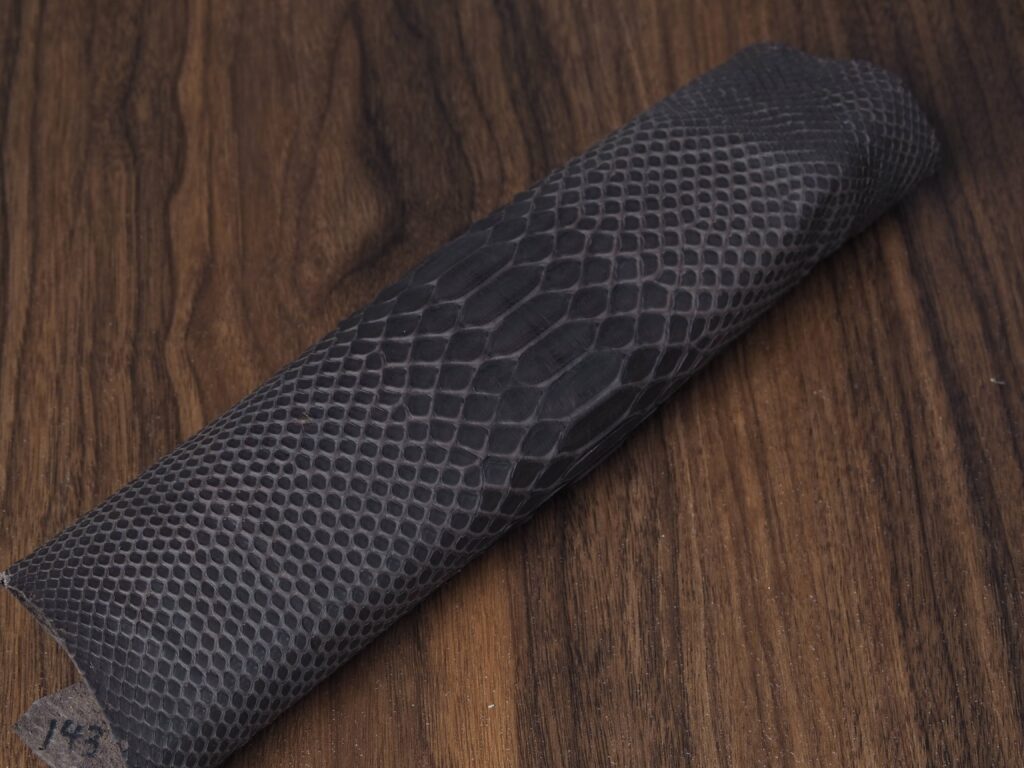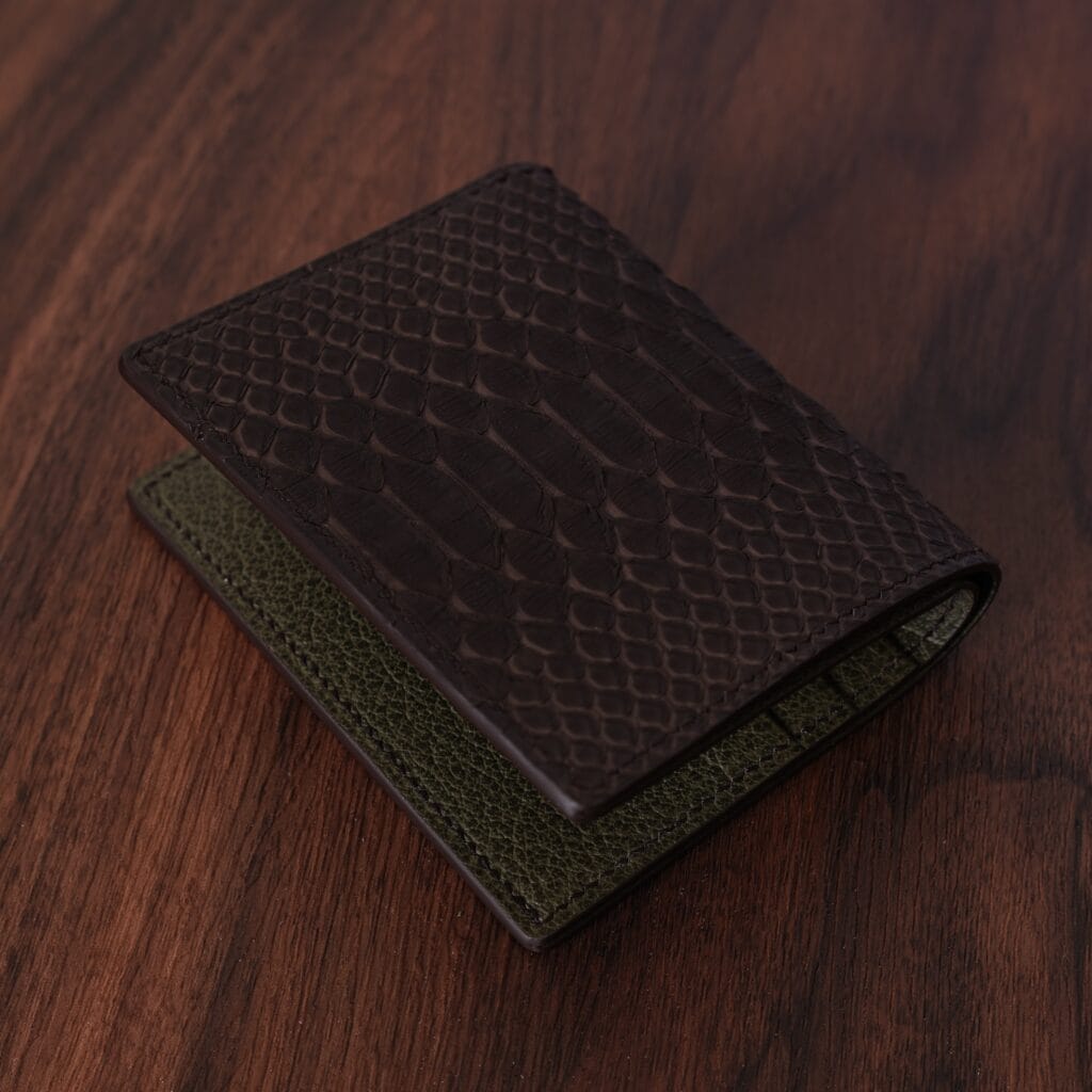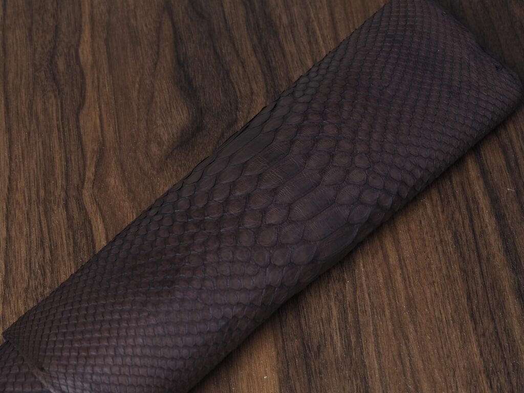 The python used is sourced from Japan and has a soft matte finish. You can expect it to see it patina. The color will darken and, it will absorb character from use. Scales are securely attached, although they may fold somewhat with use.